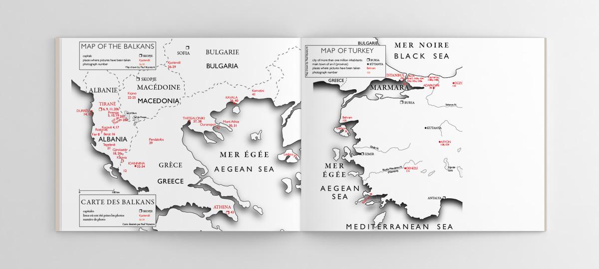 Maps showing all the places where pictures were taken. To make them easier to consult, they are printed on the cover’s reverse sides.
