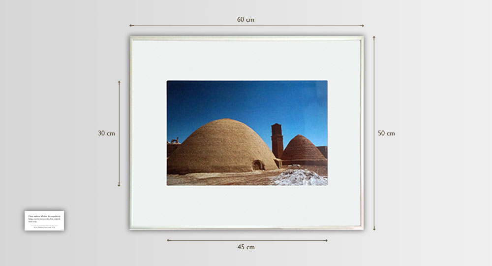 "Standard" Présentation, 54 x 80 cm prints (black margins included) encapsulated and laminated on 3mm Dibond (or 6mm Forex) with two fixing clips on the back. Weight : approx 1,5 kg per laminated picture.