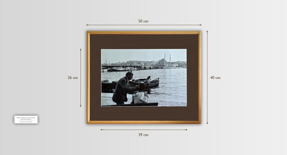 26 x 39 cm prints, mounted under dark bistre passe-partout and framed with Brio 40 x 50 cm natural wood frames. Weight: approx. 1,75 kg per framed picture.