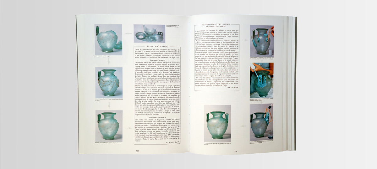 A series of pictures accompanying clear explanations from the best French specialists on all the steps required for the restoration of a Roman glass urn.